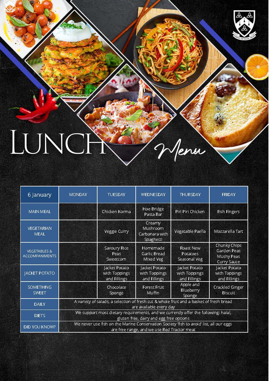 We offer a choice of a hot meal or a baked potato, homemade soup and a salad selection with a daily choice of desserts including cooked puddings or ice-cream, and fruit. We support most dietary requirements including halal, gluten, dairy and egg free options and have a no nut policy. We use organic produce where possible, Red Tractor meat that is traceable, safe and farmed with care, we never use fish on the Marine Conservation Society ‘fish to avoid’ list and all our eggs are free range.