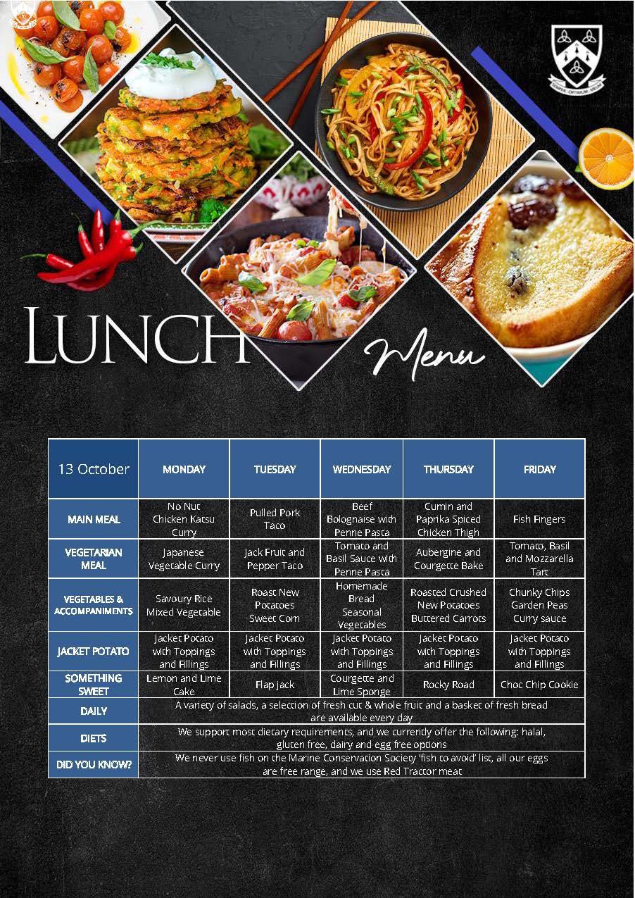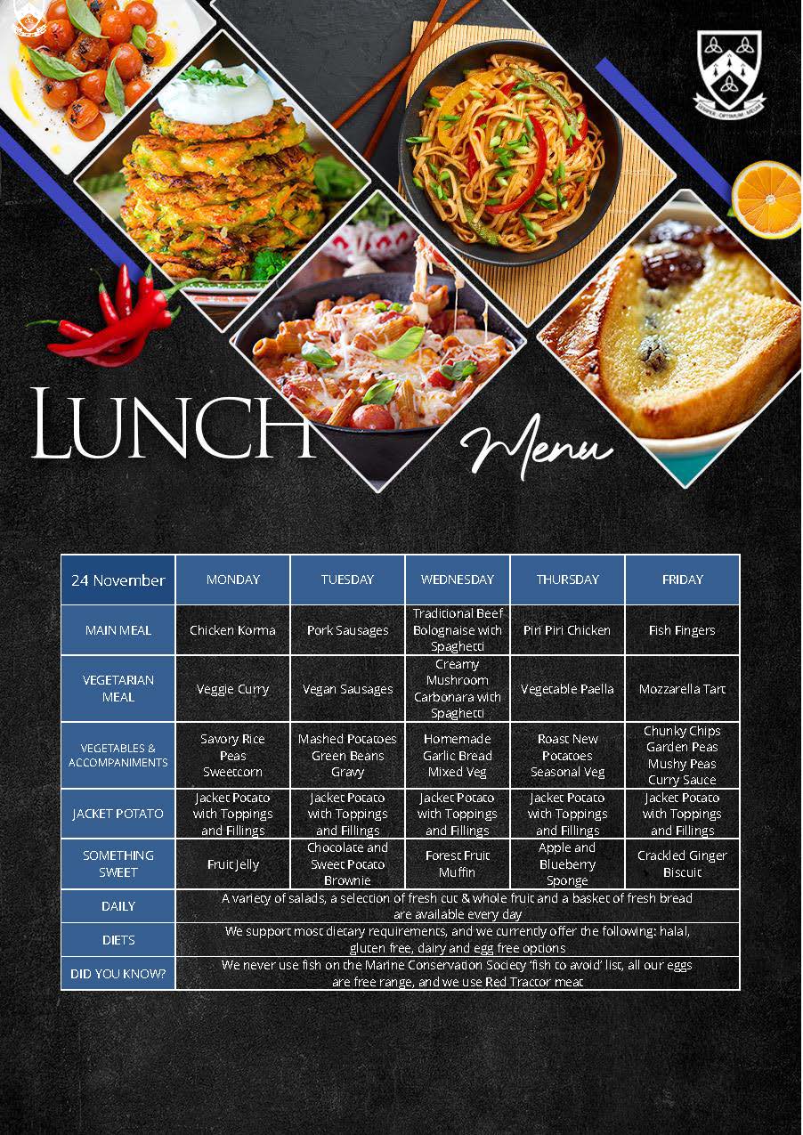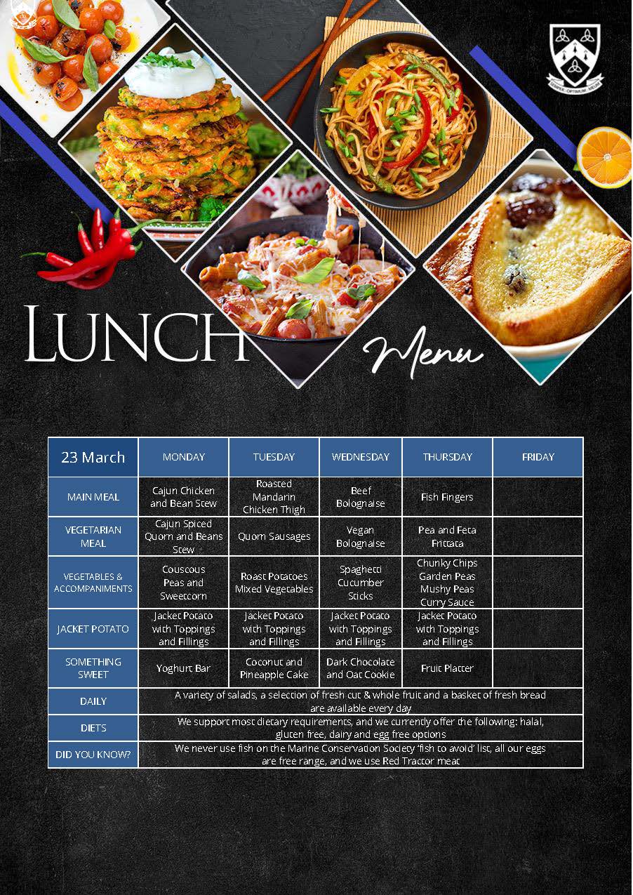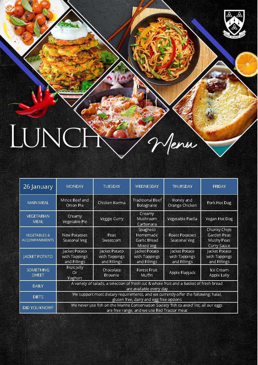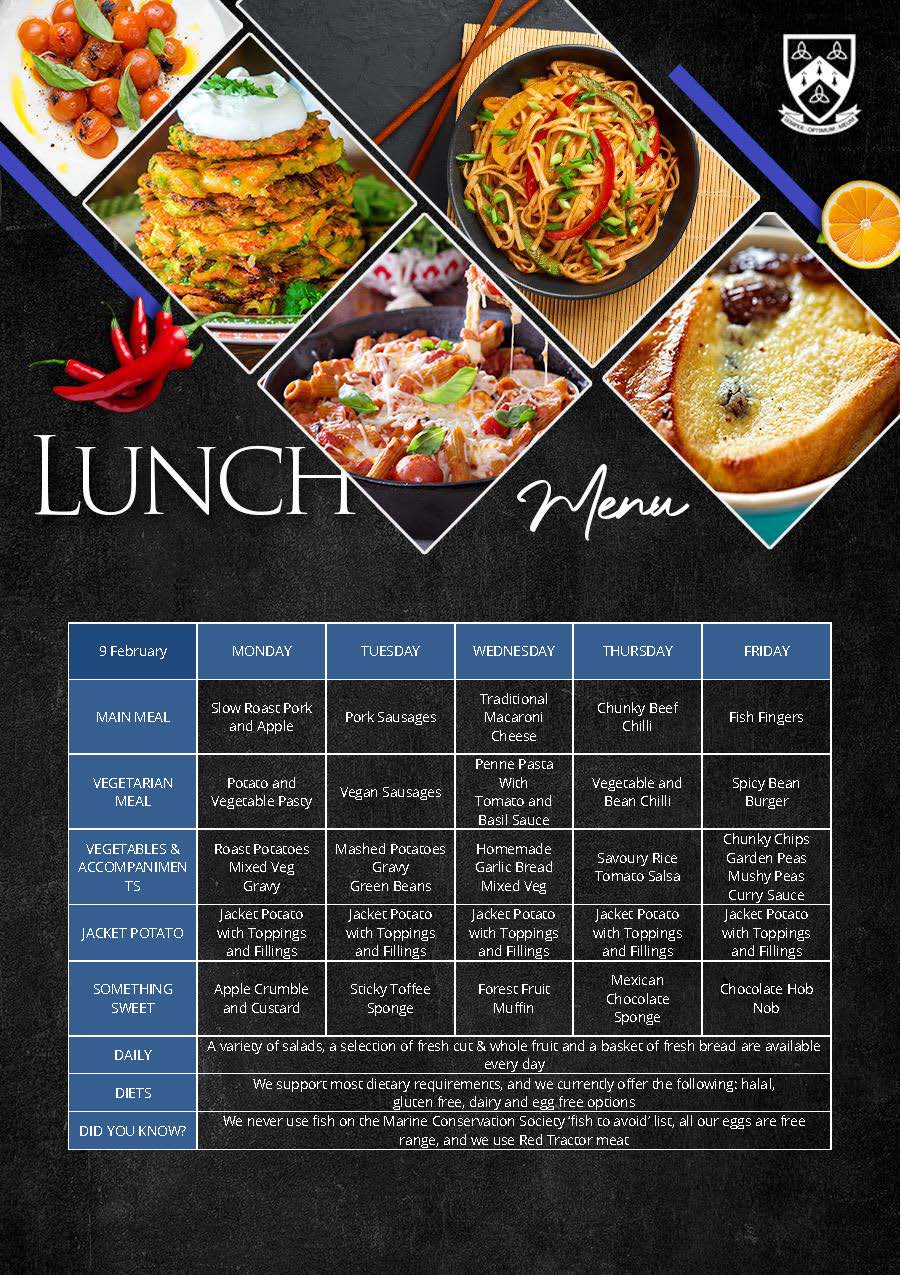 We offer a choice of a hot meal or a baked potato, homemade soup and a salad selection with a daily choice of desserts including cooked puddings or ice-cream, and fruit. We support most dietary requirements including halal, gluten, dairy and egg free options and have a no nut policy. We use organic produce where possible, Red Tractor meat that is traceable, safe and farmed with care, we never use fish on the Marine Conservation Society ‘fish to avoid’ list and all our eggs are free range.