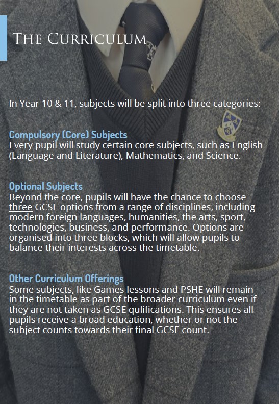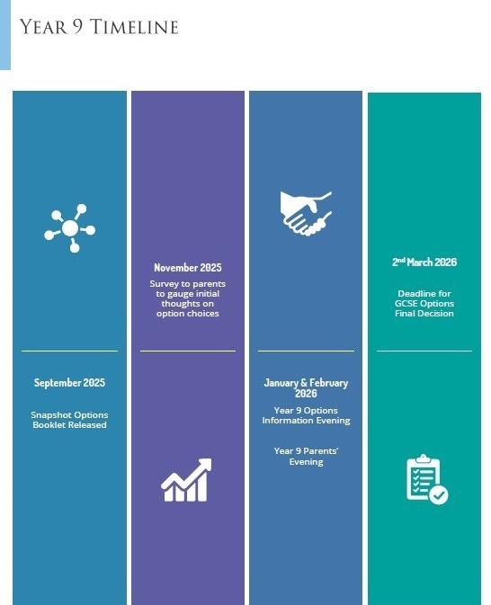 Our Year 9 GCSE options process is progressing well and has been carefully structured to support pupils and families in making informed, confident decisions. Following an initial survey in the Autumn Term, we were able to design option blocks that reflected pupil interest while also ensuring curriculum balance and effective timetabling. These option blocks were formally launched at the start of the Spring Term. Parents and pupils were invited to our GCSE Options Information Evening, which included subject “stalls” for every GCSE course on offer. Families had the opportunity to speak directly with Heads of Subject and teaching staff, alongside hearing an informative presentation from the Senior Leadership Team outlining expectations, pathways and the transition to GCSE study.